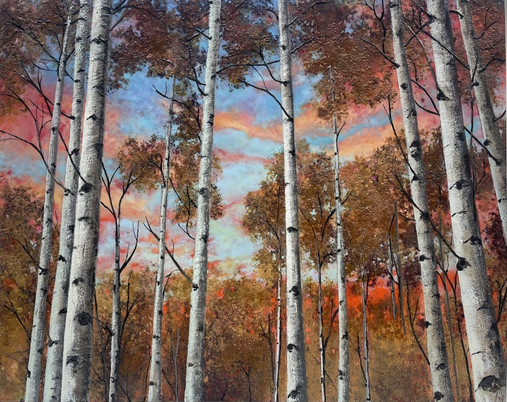 Cynthia’s work draws inspiration from the beauty of nature, capturing serene moments inspired by the splendour of western dusks, dawns, forests, mountains, and prairies. Infused with tranquility, her paintings mirror the magnificence of the sky, skillfully mastered through a multilayered approach. Her technique results in distinctive combinations and perspectives.