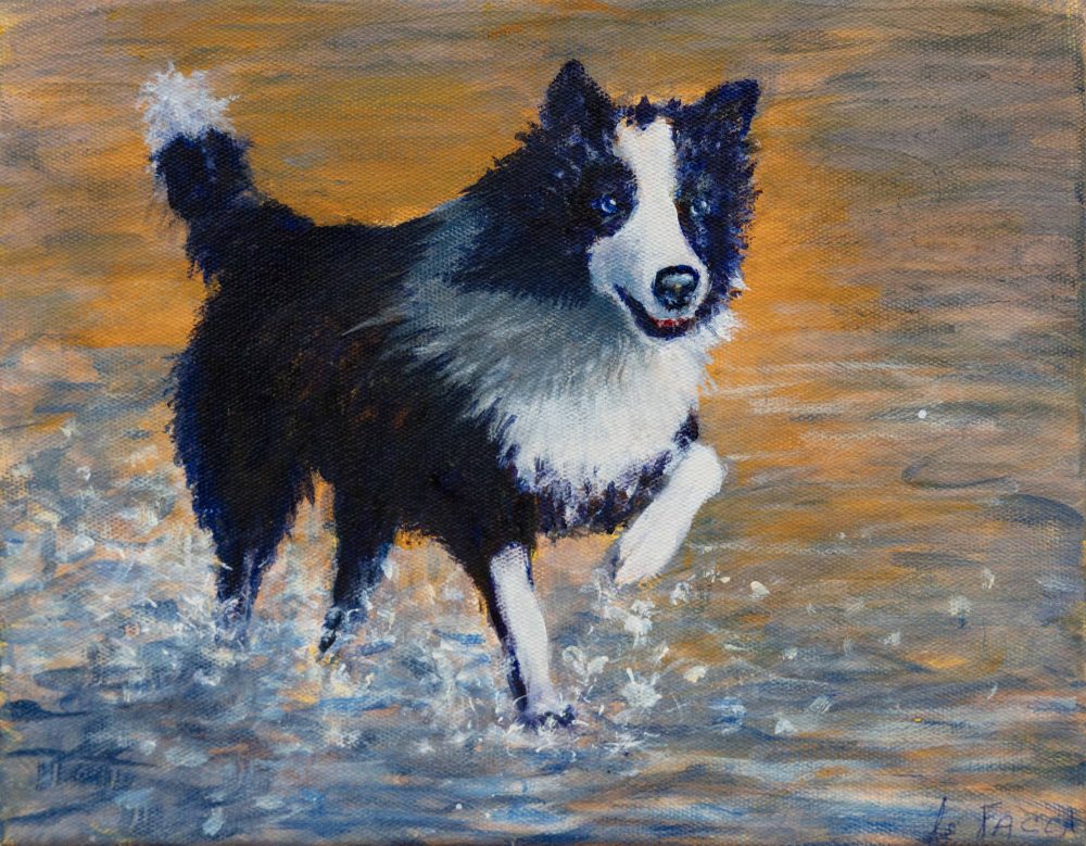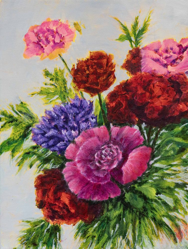 Her love of gardens, flowers, people and animals provide great subjects for painting. She likes to refer to her own photographs when developing compositions, and you will find an iPad among her favourite tools. If you ask her what is her style, she will reply that she still does not know, but likes to play around when exploring different techniques and various media. Although she started with watercolours, she has moved to acrylics, and mixed media.
